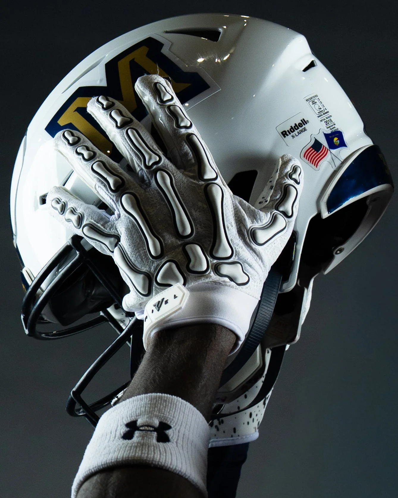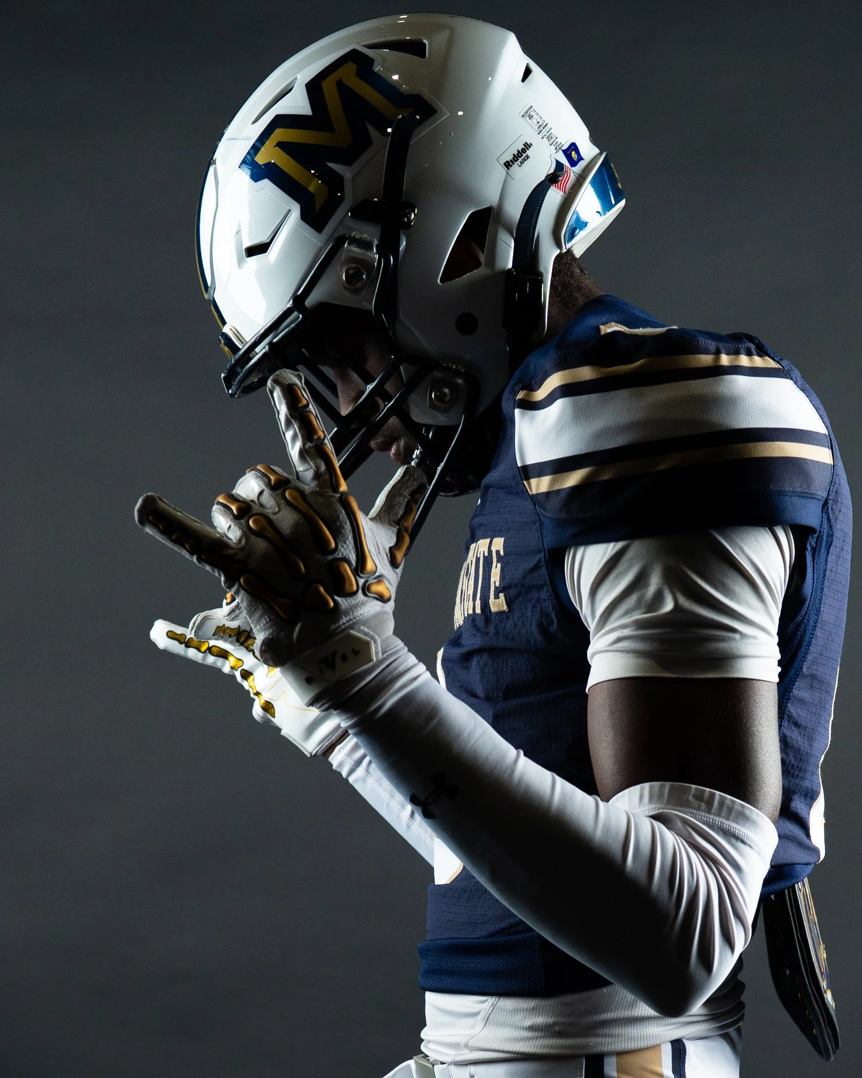 Montana State football player in navy blue jersey with number 4, wearing a gold helmet, raising his hand during a game at night with a blurred crowd and building in the background. View fullsize