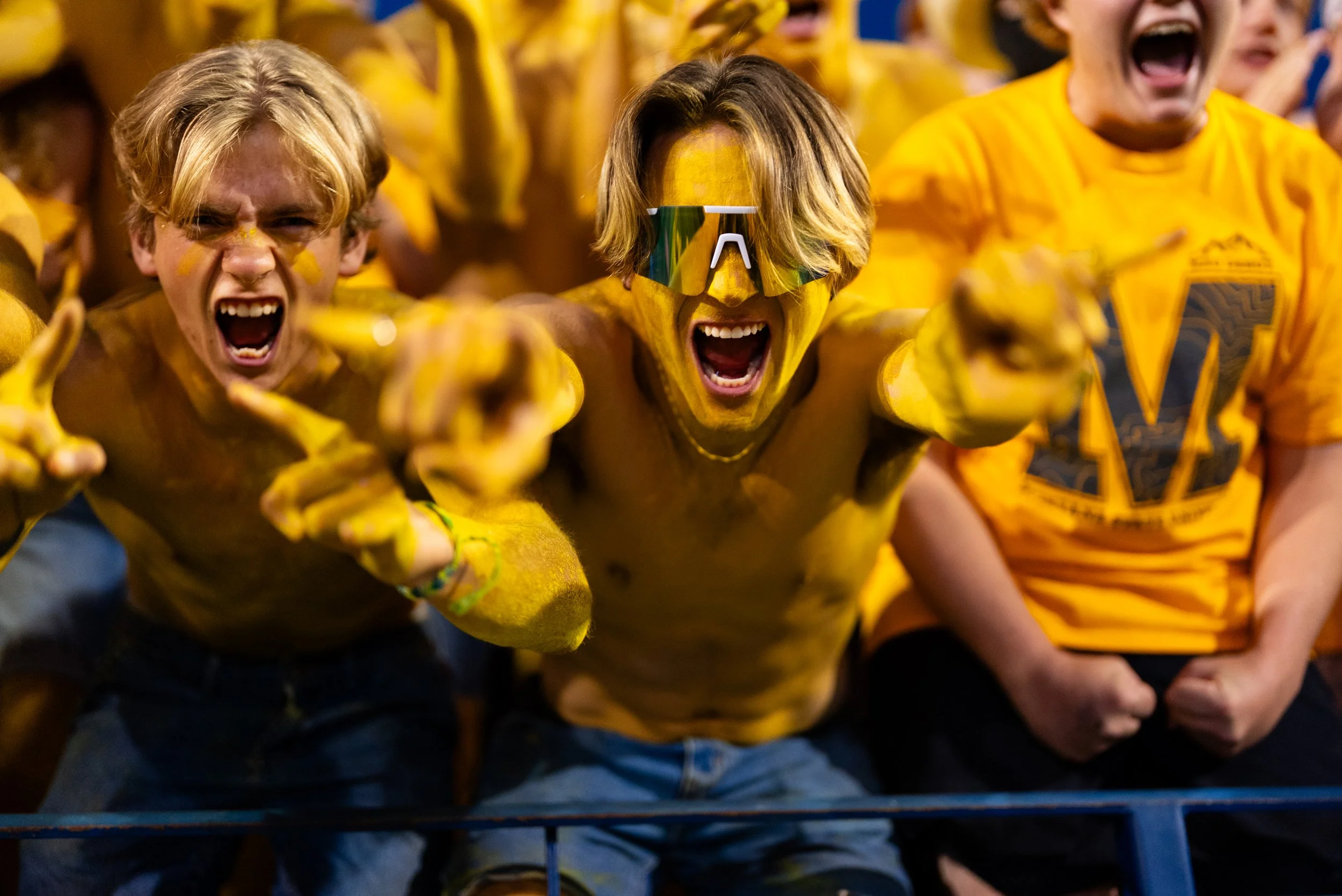 Football game at Montana State University stadium with marching band and players entering the field; crowd wearing yellow shirts; mountains in background.