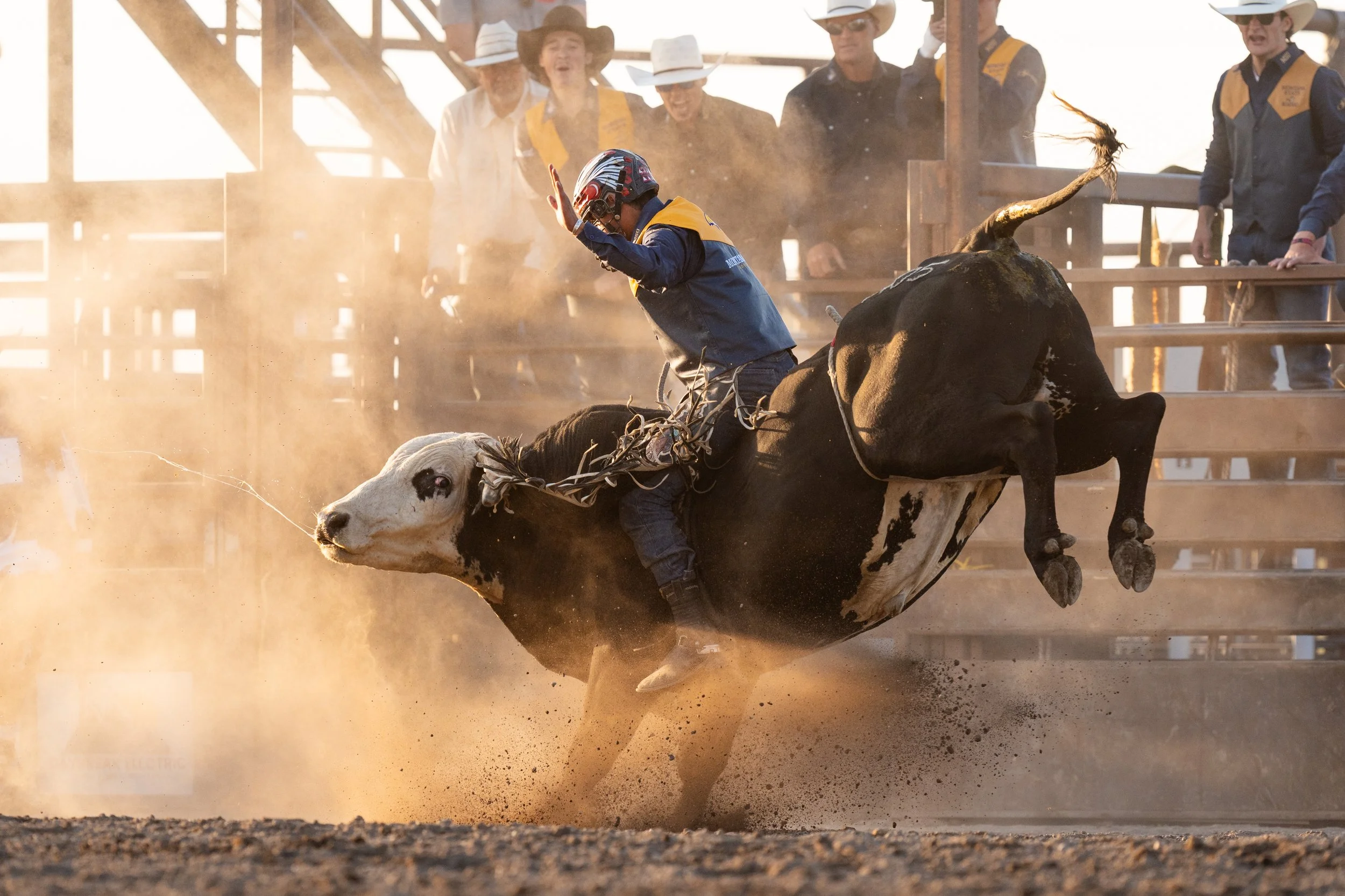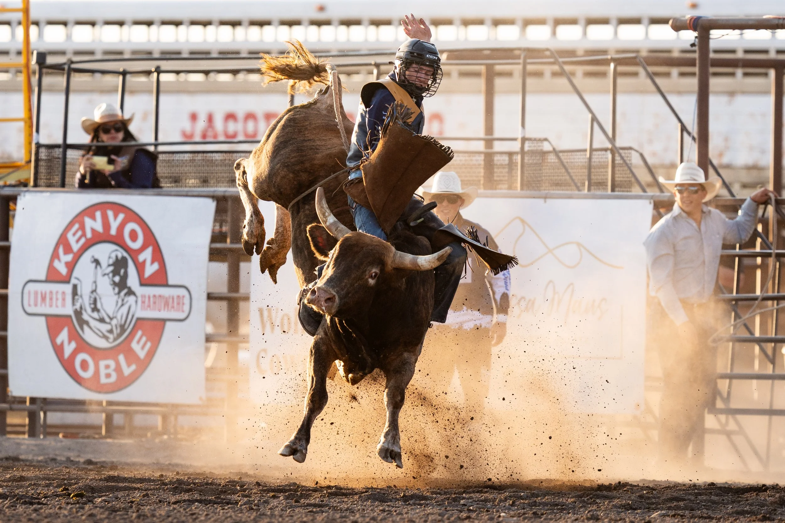 Rodeo cowboy riding a bucking bronco in an arena, surrounded by spectators in the stands.