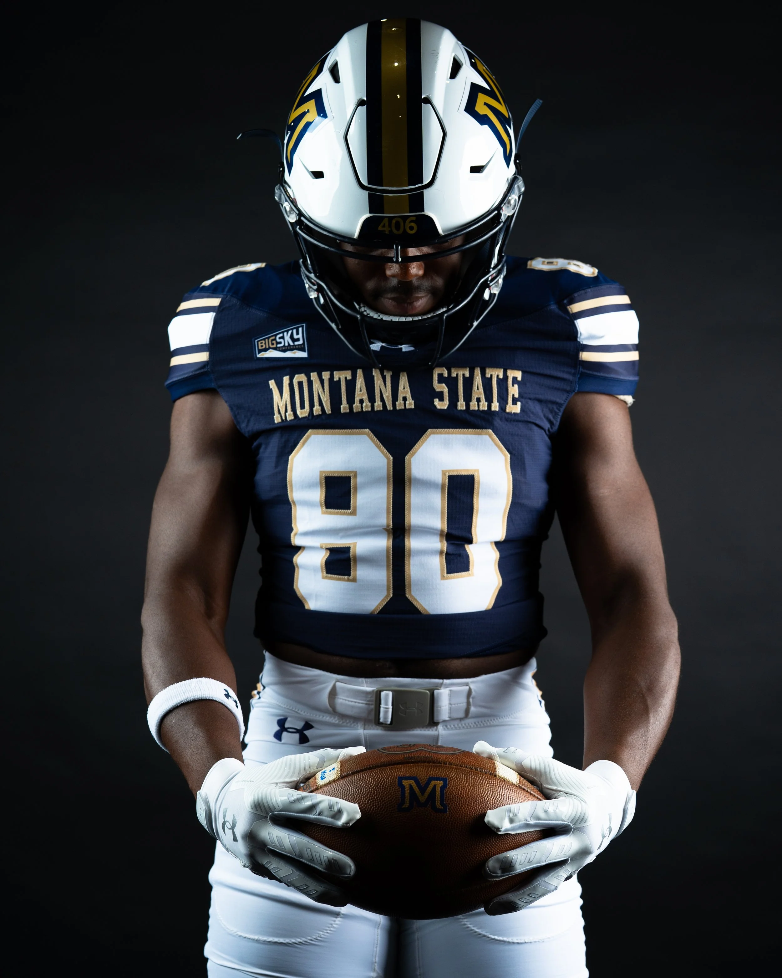American football player wearing Montana State uniform on field with crowd in background. View fullsize