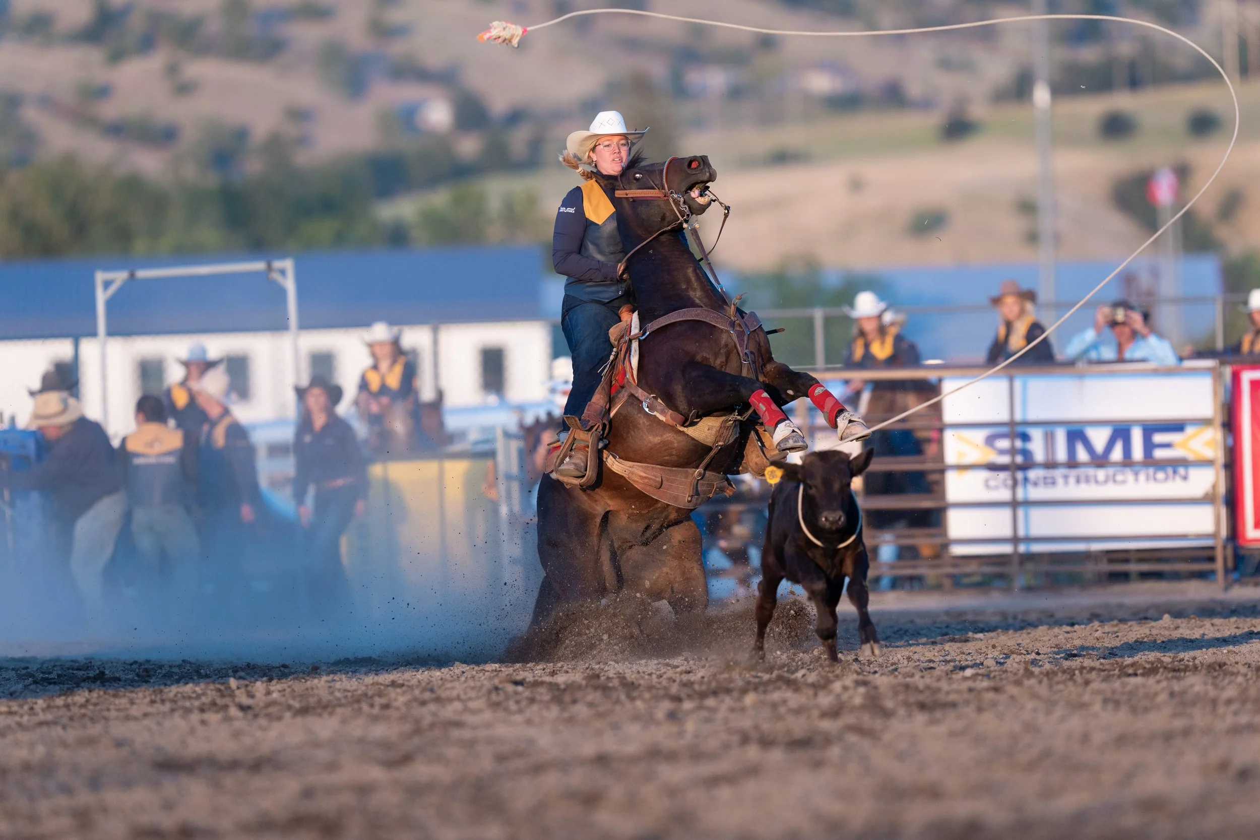 Rodeo event with person chasing goat, horse running beside, Montana State Rodeo backdrop.
