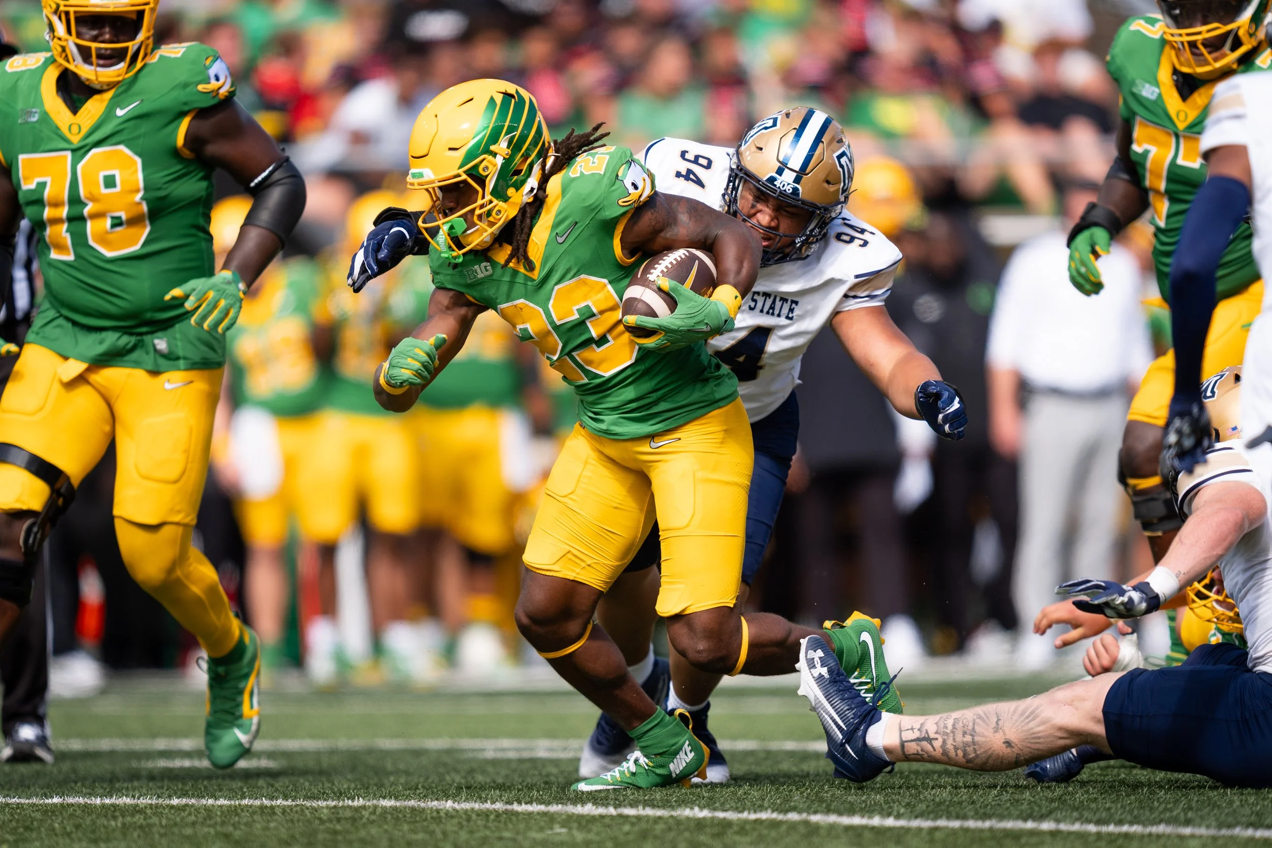 A college football game featuring a player in a blue uniform running with the ball, evading a tackle attempt by an opposing player in a white and green uniform. Other players are visible in the background on a grassy field under stadium lights. 2025