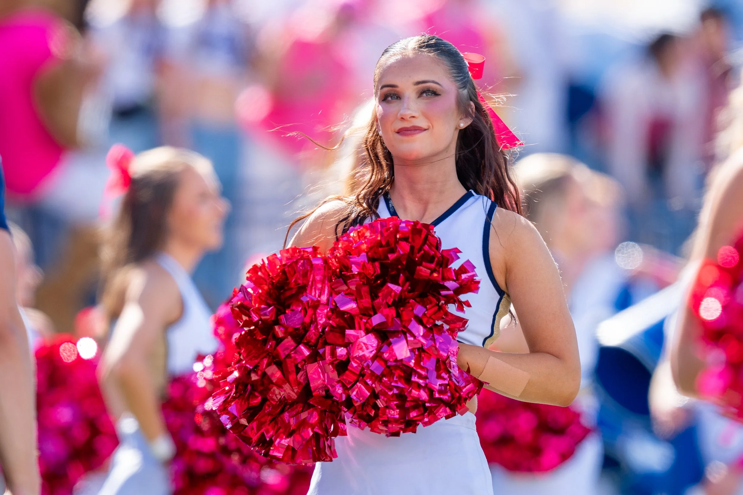 Cheerleaders holding pink pom-poms and signs with "Defense" at a sports event.